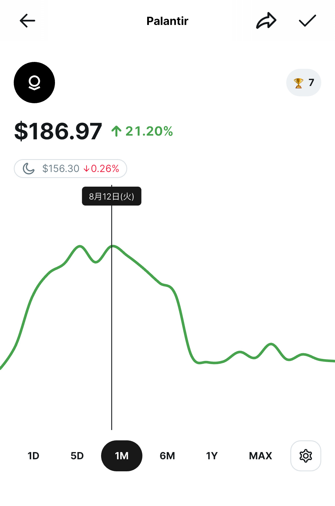 過去1ヶ月のパランティアの株価 12日を境に下落