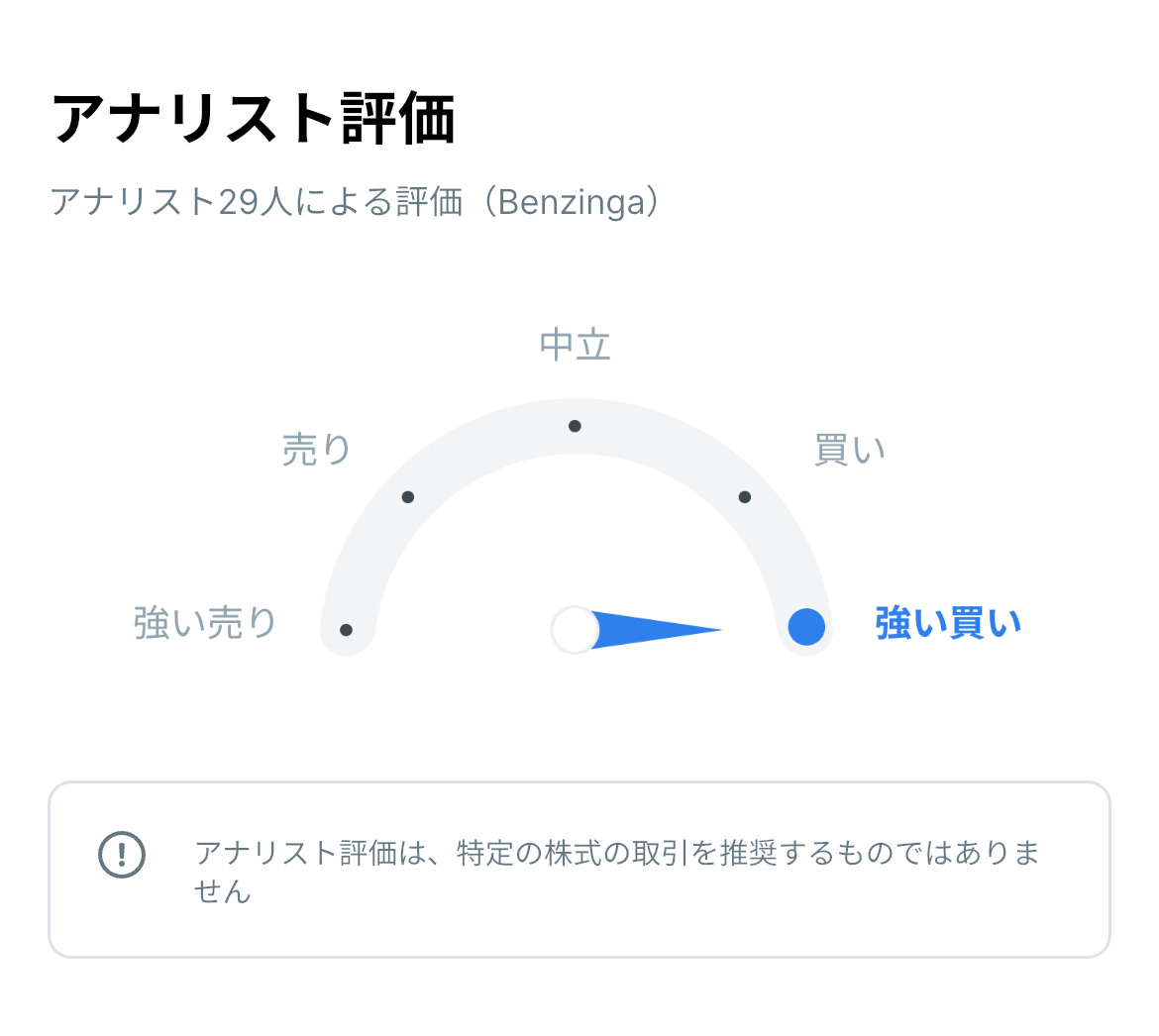この機能により、米国の金融メディアBenzinga(ベンジンガ)による「アナリスト評価」をメーターでわかりやすく確認できます。