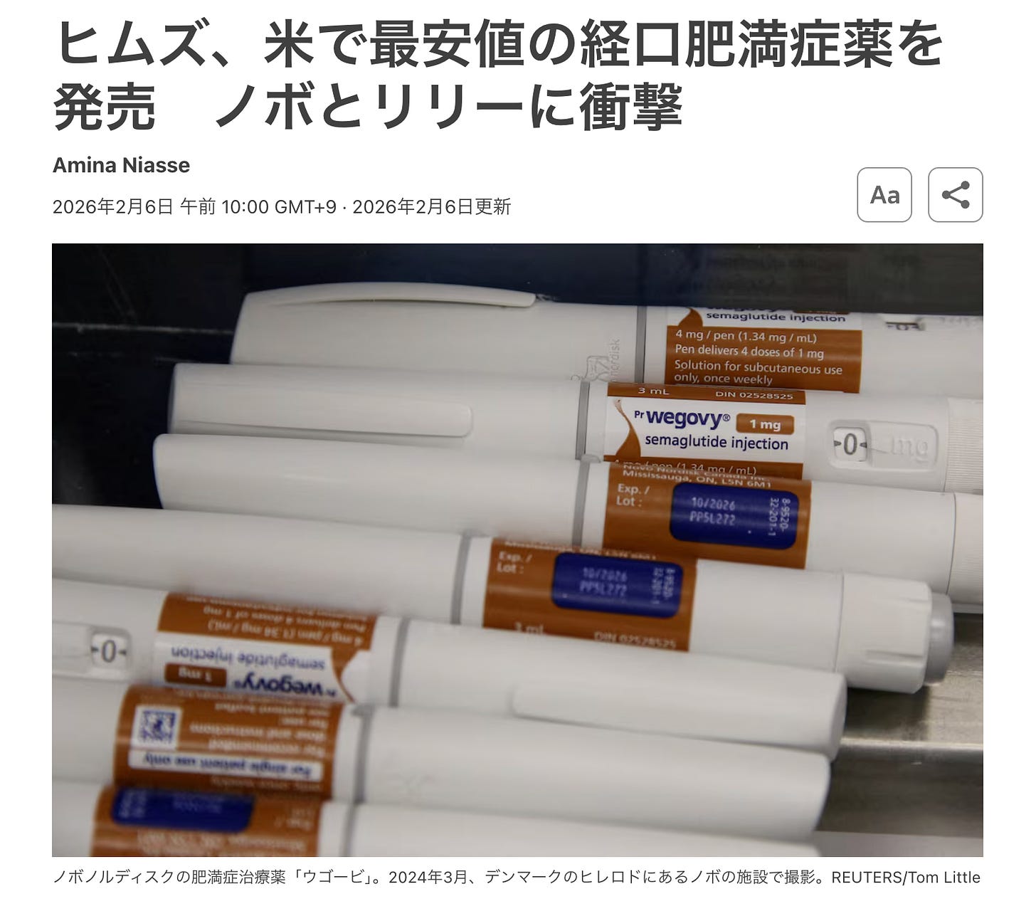 - Madison Muller, Jessica Nix(2026年)「米FDA、肥満症治療薬の模倣品規制へ-ヒムズ&ハーズなどが販売」『ブルームバーグ』2026年2月6日(更新:2026年2月7日), https://www.bloomberg.com/jp/news/articles/2026-02-06/TA256MT96OSJ00 (参照日:2026年2月9日).
