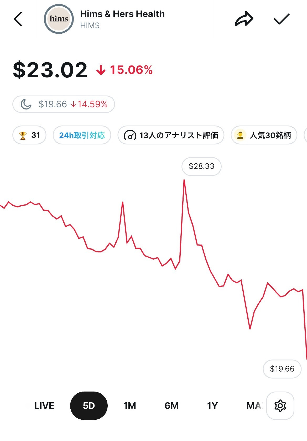 そして、Himsは当該飲み薬の発売開始二日後、販売中止を発表しました。ブルームバーグによると同社は、業界関係者との協議を踏まえ、X(旧ツイッター)で「提供を中止する」と説明。提供開始からわずか2日ほどでの撤回は、株価の重しになりました。