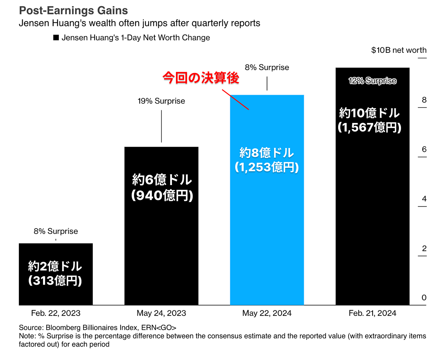 決算発表後のNVIDIA CEO フアン氏の個人資産増加量 (出典 : Bloomberg)