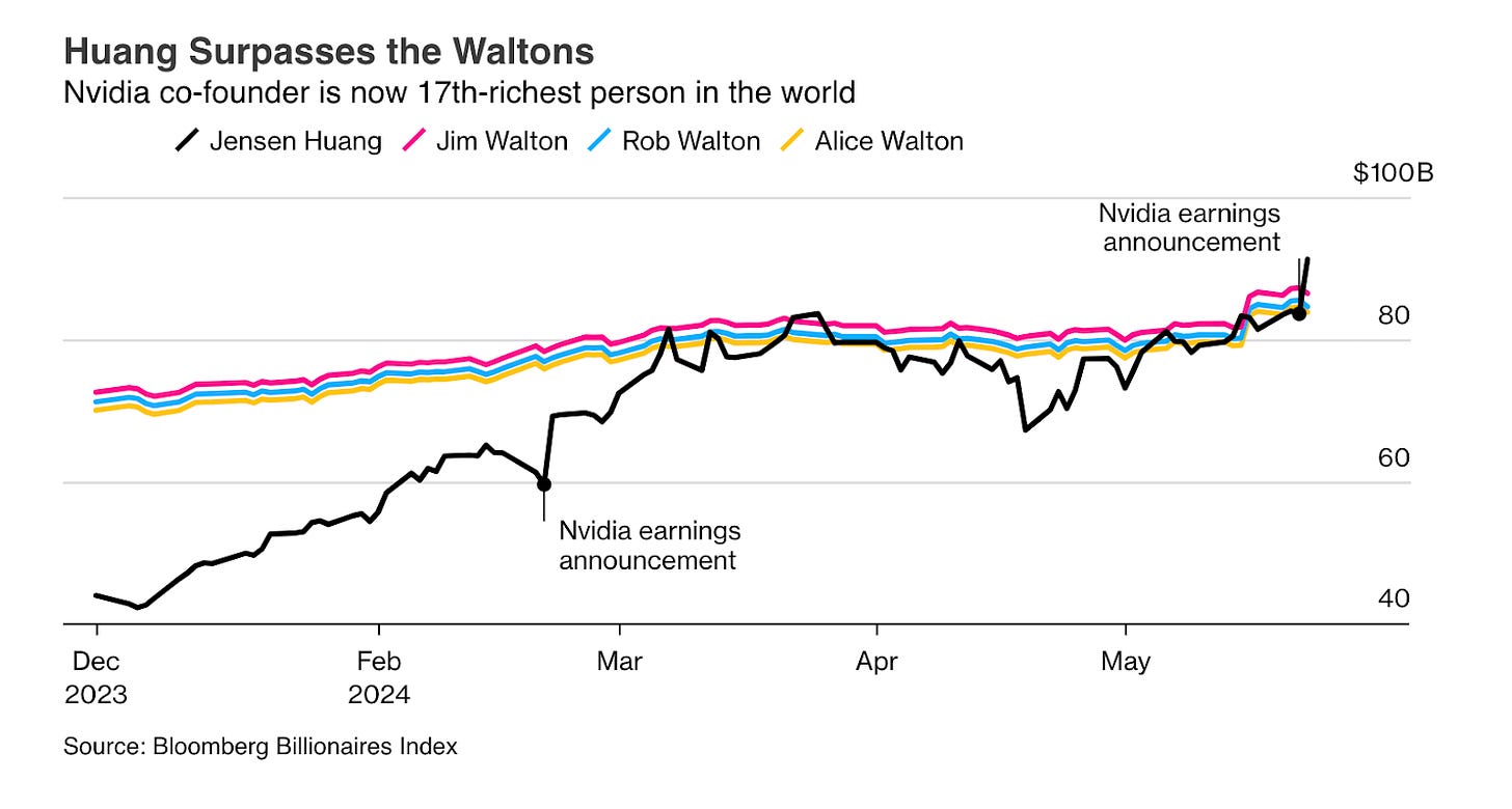 エヌビディアの驚異的な成長により、CEOのフアン氏の個人資産も大幅に増加。フアン氏の純資産は23日時点で913億ドル(約14兆3000億円)となりました。これは。米国内で最も裕福な一族、ウォルトン家のメンバーを上回る程の規模です。これにより、ブルームバーグ・ビリオネア指数の資産家ランキングで順位を3つ上げ、世界17位の資産家となりました。