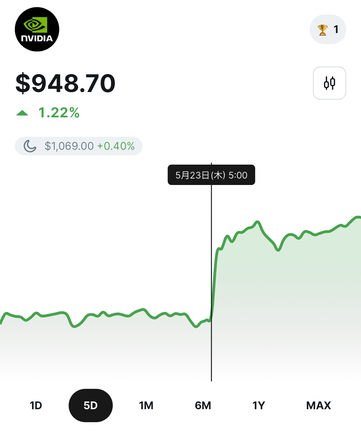 23日、NVIDIA(以下、エヌビディア)の決算発表が行われ、同社の株価は大幅に上昇しました。これは市場予想を上回る売上高見通しと、AI分野が引き続き好調であるとの見方がされていることが示唆されています。