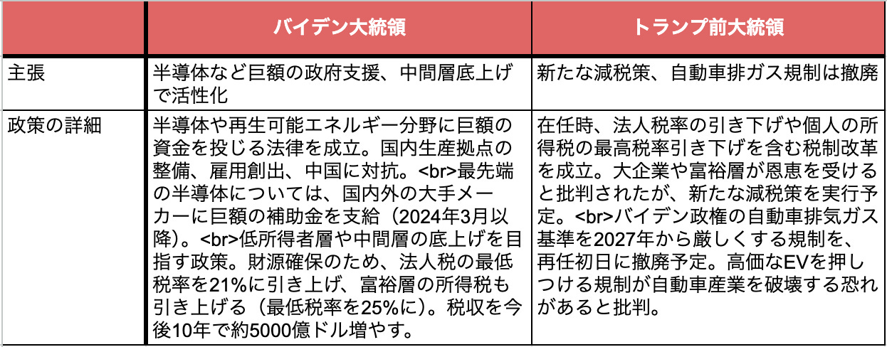 また、両候補者の経済政策に関する主張は以下の通りです。