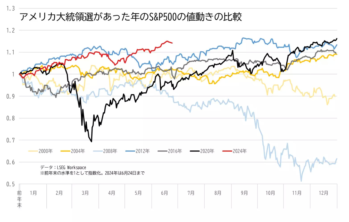 過去の大統領選イヤーのS&P500種株価指数を比較