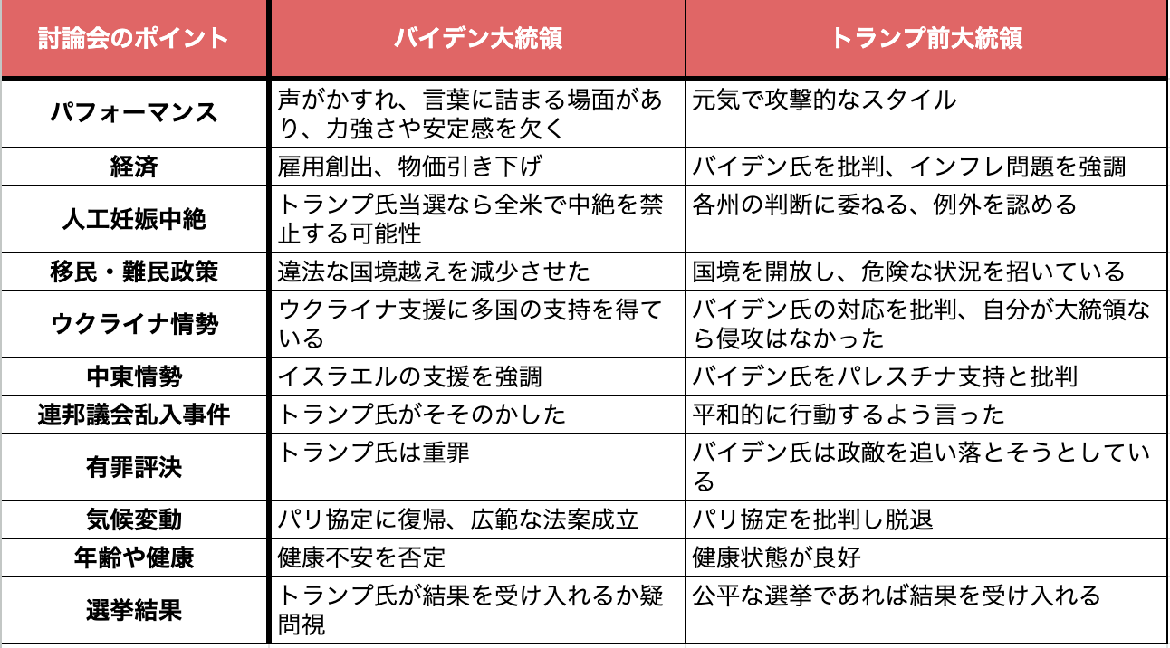 両候補のパフォーマンスや主張のポイントを表でまとめました。