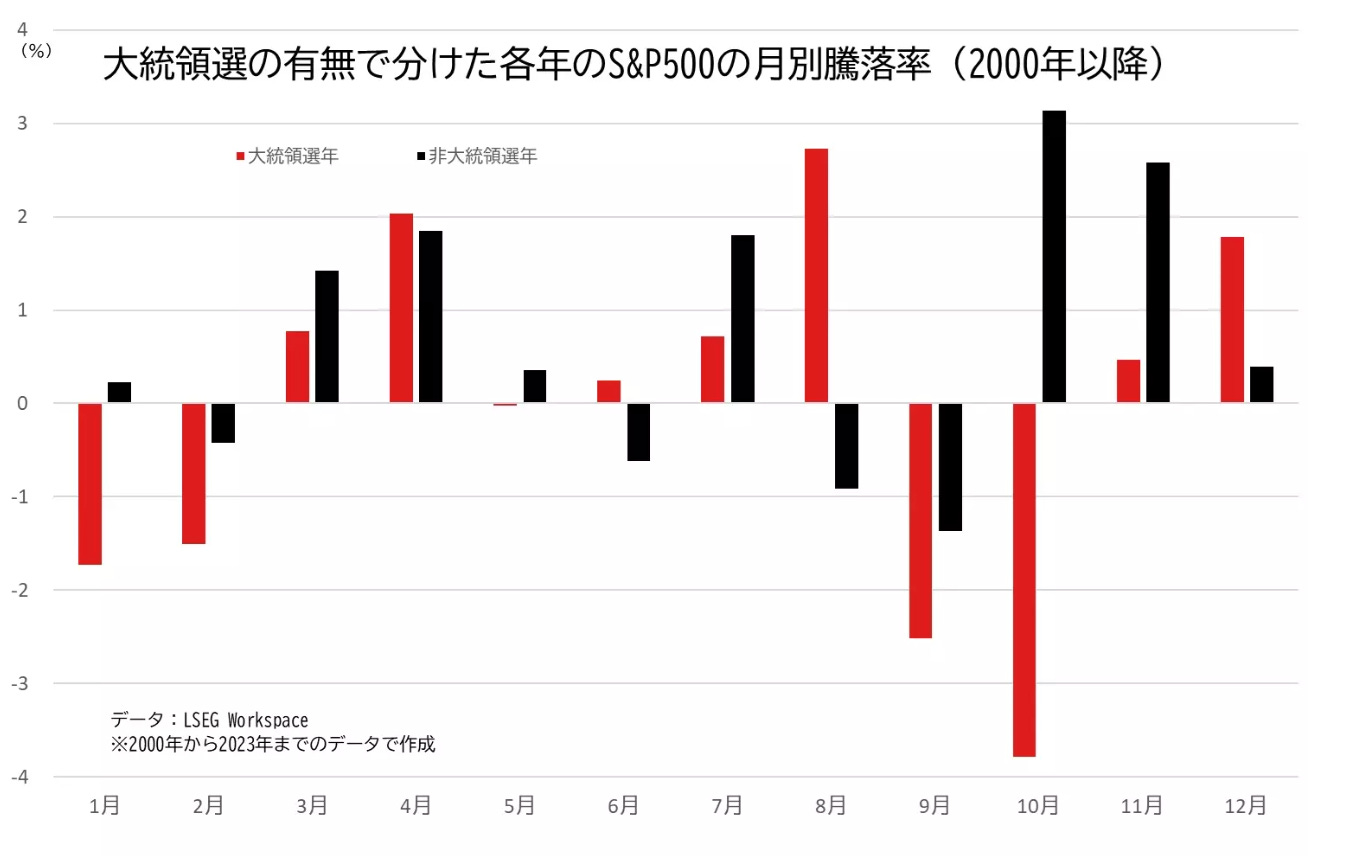 しかしながら、大統領選挙年の後半には注意が必要です。特に9月と10月には市場が下落する傾向が見られます。とりわけ選挙直前の10月は要注意で、過去6回の選挙年のうち5回で株価の下落を記録しています。この統計には、金融危機の余波が色濃く残る2008年10月の急落(16.94%減)も含まれていますが、この極端な例を除いても、10月の下落傾向は顕著です。